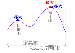 ■ 極大値,極小値(極値) ◇解説◇ 【たとえ話でスタート】 ○極大,極小と最大,最小の違い 定義域の中で一番高いのが最大 ・・・ たとえば富士山 近所で一番高いのが極大 ・・・ たとえば比叡山 (富士山は極大かつ最大) ○山の頂上が極大(その値が極大値) ○最大値はあっても1つだが極大値は複数あり得る. (極小についても同様.)