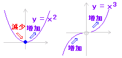 | ※ f’(x) = 0 となる点は極値の有力な候補ですが,f’(x) = 0 だからといって極値だとは限りません. 次の図でy = x2 は x = 0 において減少から増加に変化するので,極小ですが,y = x3 は x = 0において増加から増加になるので,極値ではありません. ![]() ![]() 次の図で y = |x| は x = 0 において微分係数が定義されず f’(x) = 0ではありませんが,減少から増加に変化しているので,極小です. ![]() ※ 要するに,増加,減少が「変化」しているかどうかで判断します.「崖に道路があるとき」や「折れているところ」は要注意ということです. |