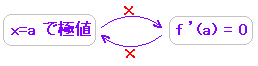 f(x) が連続関数のとき,増加から減少に変わるところを極大という.減少から増加に変わるところを極小という. また,そのときのf(x)の値を各々極大値,極小値という. 【極値の調べ方】 (1) f’(x) = 0となるところと絶対値記号などが原因で折れているところを候補に上げる. (2) 各々の候補について,増加,減少が「変化」していれば極値と判断する. ※ 理論上は ![]() |