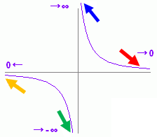 (x→−0とは,0よりも小さな値(負の値)をとりながら0に限りなく近づくことを言う.) 右図の緑色矢印 x=−0.1, −0.01, −0.001, −0.0001, ・・・のとき (参考) の場合は,ア)正の値をとりながら0に近づく場合,イ)負の値をとりながら0に近づく場合,ウ)正負の値を振動しながら0に近づく場合の,いずれかによって、極限値が変わり,どの場合なのかが指定されていないから,極限値は決まらない.極限値なしとする. もともと,∞に近づく場合も,∞は特定の値でないので「極限なし」と書くこともあるが,「極限なし」の中でも「限りなく大きくなって,極限がない場合→+∞」「限りなく小さくなって,極限がない場合→−∞」「絶対値が限りなく大きくなるが,振動して符号が定まらない場合→±∞」のように分けることができ,無限という記号を使って表すことも多い. |