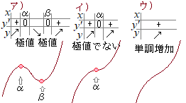 ここでは,a>0の場合を扱う. 3次関数y=ax3+bx2+cx+d…(#1)が極値を持つかどうかを調べたいとき y’=3ax2+2bx+c=0…(#2)とおいた2次方程式の実数解の個数によって,グラフの形は次の3通りに分かれる. ![]() ア) D’>0のとき (#2)の2次方程式は,異なる2つの実数解α, βをもち,(#1)のグラフは,図のア)の形になる.極大値と極小値がある イ) D’=0のとき (#2)の2次方程式は,重解αをもち,(#1)のグラフは,図のイ)の形になる. y’=0となる点が1つx=αだけあるが,その前後で増減は変化しないので,極値はない. ウ) D’<0のとき (#2)の2次方程式は,実数解をもたず,(#1)のグラフは,図のウ)のような「単調増加」になる.