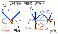 (解説)(1) 元の関数では極値でない点が絶対値付き関数では極値になることがある.これは,絶対値記号によってできる角点(折り目)で起こる. (2) 絶対値付き関数の増減を調べるには,区間を場合分けして増減表を作り,全体をつなぎ合わすのが基本です. ただし,式全体が1つの絶対値記号で囲まれている場合は,「逆さ富士」「鏡写し」の要領でx軸に対称に上下をひっくり返すだけでできる. (3) 角点(折り目)が極値になっている場合は,関数の値(極値)は定義されているが,微分係数は定義されない. 下図@は,y=xおよびy=|x|のグラフです. 下図Aは,y=x(x−2)およびy=|x(x−2)|のグラフです. (2)→いずれも,赤色のグラフをx軸に対称に上下をひっくり返したものが青色で示した絶対値付き関数のグラフです. (1)→このようにしてできる絶対値付き関数のブラフは赤丸で示した点が「角点」(=折り目)になっています. (3)→数学Uでは詳しく教えている時間はありませんが「x=αの近傍のどんな値に対してもf(α)≦f(x)が成り立つとき,x=αで極小」と言います.だから,(連続な関数を前提として)微分係数が0にならなくても,減少から増加に変化している点があれば,その点で極小になります. 「x=αの近傍のどんな値に対してもf(α)≧f(x)が成り立つとき,x=αで極大」と言います.だから,(連続な関数を前提として)微分係数が0にならなくても,増加から減少に変化している点があれば,その点で極大になります.