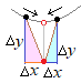 不連続点で極限値と関数値に「ギャップ」があって,それらが一致しないとき,右図のようにΔx→0のときに図(C2)のように,右側だけが連続となっている場合, 右側微分係数 となって,左右の微分係数が一致しないから,微分係数は存在しません. |