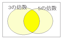 (解答)100÷3=33・・・1 100÷5=20 100÷15=6・・・10 3の倍数となる確率は 5の倍数となる確率は 15の倍数となる確率は ⇒ + − = を答とする. この例では,A 「3の倍数」,B 「5の倍数」,とするとき,A と B の共通部分があるので,単に P(A)+P(B) を計算すると二重に足してしまう部分ができる.そこで,二重の部分 P(A∩B) を引いて答にする.