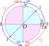 ⇒「タンジェントはy/xの比率」 右図の単位円で,(縦)÷(横)の比率が正で1となる角度は, |