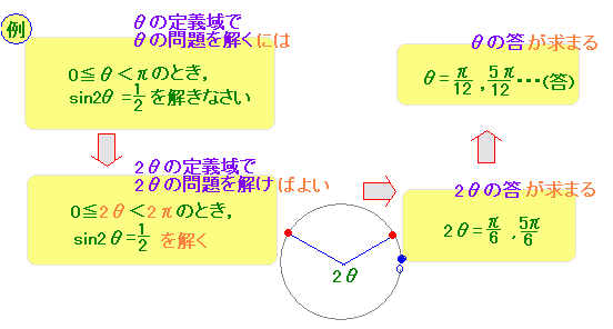 【解説】 ○ 次のような問題では,2θの問題に直して解く。 ![]() ○ 次の問題では, ![]() |
