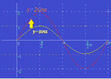 ○1 y=asinxのaの値は,「中腹から山頂までの山の高さ」を表しています.(縦方向に引き延ばす倍率になります.) 次の図はy=2sinxのグラフを表しています. y=−1sinxのようにaが負の値のときは,上下が逆になります. y=−2sinxのときは,上下が逆で2倍に引き延ばしたものになります。 ![]() ○2 y=sinbxのbの値は,横方向に縮める倍率を表しています. 次の図はy=sin2xのグラフを表しています. ![]()