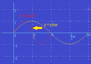 y=sinのときに,横方向に2倍になります. ※この部分は,間違いやすいので注意してください. ※0≦x≦πの間だけで,0≦2x≦2πになるので,sin2xはsin0からsin2πまで一周すると考えるとよいでしょう. ![]() |