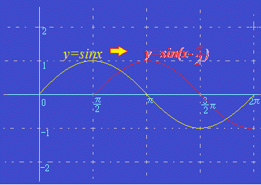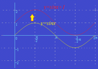 ○3 y=sin(x−p)のpの値は,xの正の向きに移動する量を表しています. 次の図はy=sin(x−)のグラフを表しています. y=sin(x−)のときに,xの正の向きにだけ移動します. y=sin(x+)のときは,xの向きに−だけ移動します. ![]() ○4 y=sinx+qのqの値は,yの正の向きに移動する量を表しています. 次の図はy=sinx+1のグラフを表しています. ![]() |