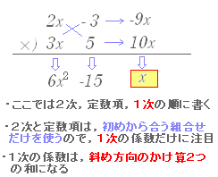 ◇たすき掛け因数分解とは◇x2 の係数が1でない2次式を因数分解する一つの方法が,たすき掛け因数分解と呼ばれる方法である.次の例のように,x2 の係数が1でない2次式を因数分解するためには,4個の係数を一度に思いつかなければならないので大変であるが,もし次の形に書けるとすれば, 2次の係数:[ア]×[ウ]=6 定数項: [イ]×[エ]=− 15 となるはずなので, ○「掛けて6,掛けて−15となる2組の数を持ってくれば,後は1次の係数が合えば答になる」