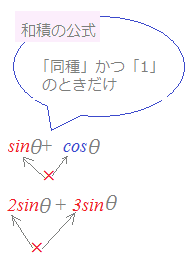 (解答)(1) sin, cosが同種であるとき. (2) 係数がいずれも1であるとき. に限り,積に直すことができます. 次のような式は,この公式を使った変形ができません. sinA+cosB ←sin, cosが混ざっている. 2sinA+3sinB ←係数が1ではない. なお 2sinA+3cosA のような形の式は「三角関数の合成公式」を使った変形ができます. sin4θ+sin2θ=2sincos=2sin3θ·cosθ |