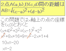 ![]() 左の問題では ABの傾きは2、これに垂直な傾きは-1/2 ABの中点は(1,1) そこで(1,1)を通り,傾き-1/2の直線の方程式を求めます。 y-1=-1/2(x-1) 2y-2=-x+1 x+2y-3=0 |