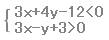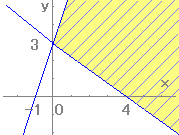 ○y=mx+kの直線の上側はy>mx+kで表わされ,下側はy<mx+kで表わされます。共通部分は連立方程式で表わします。 左の問題では,y=-3/4x+3の上側でy>-3/4x+3 → 4y>-3x+12 → 3x+4y-12>0 y=3x+3の下側でy<3x+3 → 3x-y+3>0 となります。 |