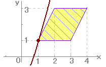 ○領域内の最大値 求める式の値を=kとおくと方程式になり、グラフが書けます。 領域を通るようなグラフのうちkが最大となるものを探します。 左の問題では、y-3x=kとおくと y=3x+kの傾きは3だから右図のようにx=1,y=1でkが最大となり、このときy-3x=1-3=-2=k ![]() |