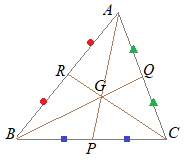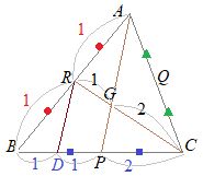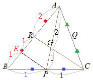 (*2)の証明←![]() 線分の長さは,同じ色同士で「比」を表すものとする まず,APとCRの交点をGとおくと,CG:GR=2:1になることを示す.