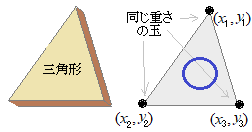 (2) 結論から言えば は,「発砲スチロールのトレイのように重さがほとんどなくて,構造はしっかりしている物の上に,3個の(同じ重さの)重りがあるときの重さの中心」になっています.このように複数の質点から成るシステムを質点系といいます.実は,(*3)(*4)(*5)は物理で質点系の重心を表す公式になっています. ![]() ![]() |