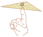 (1) 「重心」とは何かということを端的に説明するために,三角形の均質な板(例えば三角定規)で,そこを支えると板全体を支えられる点のことだという説明をすることがある.中学・高校の同級生の中には器用な者がいて,右図のような三角定規や下敷きを指の先でうまくバランスをとって遊んでいた.これは,「重心」をとらえているからである. ところで,三角形の重心が で表されるのなら,その類推で四角形,五角形の重心は になるだろうと期待するが,全然違う. |