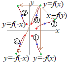《x軸に関して対称》右図の⓪と@ 《y軸に関して対称》 右図の⓪とA 《y=xの直線に関して対称》 右図の⓪とB 《原点に関して対称》 右図の⓪とC これらはy軸に関して対称:A→カ y=xの直線に関して対称:B→キ だから,これらはx軸に関して対称:@→ク これらはx軸に関して対称:@→ケ |
