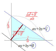 右図のように,ax+byの値が1だけ違うとき,平行な2つの直線の間隔は,次のように求めることができる.ax+by=1 (a, b≠0)の直線について,y=0のとき これは,斜辺の長さ (公式のまとめ) 点(x0, y0)と直線ax+by+c=0 (a2+b2≠0)の距離は |