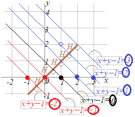 x+y=0 ⇒ x+y−1=−1となることからも分かります.この事情は,直線x+y=0上の点(−1, 1)や(1, −1)についても同様で,直線x+y=0上の点は,すべてx+y−1の式の値が−1になります.