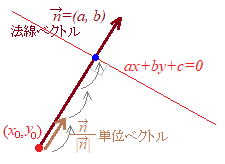 (数学Bのベクトルを使った証明) ※各々の教科書には,数学Uで習う範囲を逸脱しないように気を付けながら,無駄なく正確な証明が書かれていますが,結構長い証明になっており,それらの数式変形を目で追っていくのは苦痛を伴います. 特に,どこに連れて行くのか,今どこにいるのか,その変数は何を表すのかが必ずしも明らかでないとつらい.(生徒も) ここでは数学Bのベクトルを使って,もっと視覚的に分かりやすい方法で「点と直線の距離の公式」を証明することを考える.その延長でさらに,3次元空間における「点と平面の距離の公式」も示すことを目指す. ![]() そこで,点(x0, y0)から,その単位ベクトルの何倍を継ぎ足せば直線ax+by+c=0上にあるかを調べたらよい.この倍率tが求める距離になる. 点(x, y)が,直線ax+by+c=0上にあるためには 距離は正の数だから |