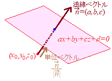 (証明)![]() 平面ax+by+cz+d=0の法線ベクトル そこで,点(x0, y0, z0)から,その単位ベクトルの何倍を継ぎ足せば平面ax+by+cz+d=0上にあるかを調べたらよい.この倍率tが求める距離になる. 点(x, y, z)が,平面ax+by+cz+d=0上にあるためには 距離は正の数だから |
