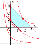 ⇒ xy=kとおく.直角双曲線(中学1年生で習う反比例のグラフ)でkの値が最大・最小となる点を探せばよい.