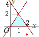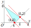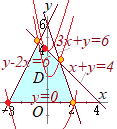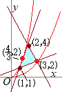 (1)右図の青色で示した斜線部の内部および境界線上 (2) 4x+y=k すなわち y=−4x+k とおくと,傾きが−4の直線(赤で示した直線)になる.