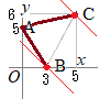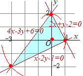 x2+y2は原点からの距離(の2乗)だから,• 2x+y−2=0と4x−3y+6=の交点は(0, 2) • 4x−3y+6=0とx−2y−1=0の交点は(−3, −2) • 原点(0, 0)において最小値0をとる • 点(−3, −2)において,最大値13をとる・・・(答) |