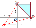 条件を満たす領域は右図の水色で示した部分(内部および周上)すなわち とおくと,kは,点(−2, −1)を通る直線の傾き • 点(2, 0)において最小値 • 点(0, 2)において最大値 |