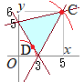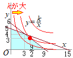 条件を満たす領域は,右図の水色で示した部分(内部および周上)この領域内において,xy=kすなわち のグラフを考える. xy=kと2x+3y=18が接するようなkの値を求める. |