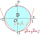 (1)右図の右図の水色で示した部分(内部および周上) なお,2つの曲線は(±1, 0), (0, −1)の3点を共有点とするが, −1<x<0, 0<x<1の区間で