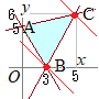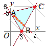 条件を満たす領域は右図の水色で示した部分(内部および周上)交点の座標は2つずつ選んだ連立方程式の解として求められ,A(0, 5), B(3, 0), C(5, 6)となる. • x+y=kすなわち,y=−x+kとおくと,傾きが−1の直線になるから,右図で赤線で示したように 点B(3, 0)において最小値3+0=3をとる. 点C(5, 6)において最大値5+6=11をとる.・・・(答) (雑談のようで雑談ではない話)・・・本気の授業 上の答案でx+y=kの直線が通っていると言っても,最大値となる点はCの1つしかない.最小値の方も同様にBが1つだけ.・・・こんな頼りない話でよいのか?と思うかもしれませんが,この点に目を向けると,領域内の最大最小問題に鋭く切り込んでいける.