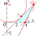 連立不等式の表す領域は,右図の水色で示した箇所x2+(y−4)2=kとおくと,kは 点(0, 4)からの距離の2乗を表す. 右図の点Pは,点A(0, 4)を中心とする円と直線y=x−2すなわちx−y−2=0が接する場合の接点で k=AP2=18・・・(最小値:答) 右図の点Qは,2直線y=x−2, y=2x−8の交点(6, 4)で k=AQ2=62=36 右図の点Rは2直線y=2x−8, y=0の交点(4, 0)で AQ>ARだから,最大値はk=AQ2=62=36・・・(答) |