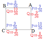 SPの出た目の和がp=2, 6, 10のとき,Pは点Cにある.ここで,p=2, 6, 10となるのは,1+5+3=9通り.その確率は同様にして,SPの出た目の和がp=3, 7, 11のとき,Pは点Dにある.ここで,p=3, 7, 11となるのは,2+6+2=10通り.その確率は 同様にして,SPの出た目の和がp=4, 8, 12のとき,Pは点Aにある.ここで,p=4, 8, 12となるのは,3+5+1=9通り.その確率は 同様にして,SPの出た目の和がp=5, 9のとき,Pは点Bにある.ここで,p=5, 9となるのは,4+4=8通り.その確率は 同様にして,Qが点A,B,C,Dにある確率は各々 P,QともAに来るのは, P,QともBに来るのは, P,QともCに来るのは, P,QともDに来るのは, 結局,P,Qが同じ位置になる確率は |