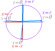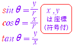 | ○三角関数の符号 上図のように各象限ごとに x , y の符号が決まっているので,三角関数の符号が定まる. ![]()