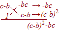 これらの組合せの内で,aの1次の係数が(c−b)2−bcになるものをたすき掛け因数分解で考えると,右図のようになる.この図は((c−b)a−bc)(a+(c−b))の省略であるから (ca−ab−bc)(a−b+c)…(答) |