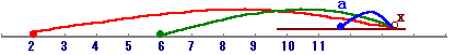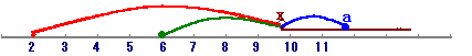(1) a=5のとき,3≦x≦7(図の茶色の区間)において,赤と緑で示したヒモの長さの和は, ア) 3≦x≦6のとき一定(4)だから青で示したヒモが最小のとき(x=5)最小値4となる. ![]() ![]() m(5)= (x=5のとき) M(5)= (x=7のとき) (2) a≦8ではm(a)が14にならない. a>8のとき ア) a−2≦x<aでは赤+青が一定(a−2)だから,緑が最短のx=a−2で最小値 (a−2)+(a−2−6)=2a−10をとる. ![]() ![]() このとき,M(12)はx=14で実現されるので,M(12)=・・・(答) ![]()