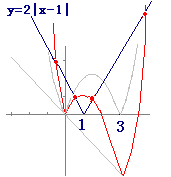 《解説(つづき)》 ■ 1次関数の絶対値は,符号が正になっても負になっても1次関数です.したがって,それらの和・差・定数倍は1次関数で,折れ線になります.このことに注意すれば,煩雑な場合分けをせずに節目(と両端の延長)を結んでいけばグラフを作ることができます. ■例10 次の関数の最小値を求めなさい. y=4|x|−3|x−1|+2|x−2|−|x−3|