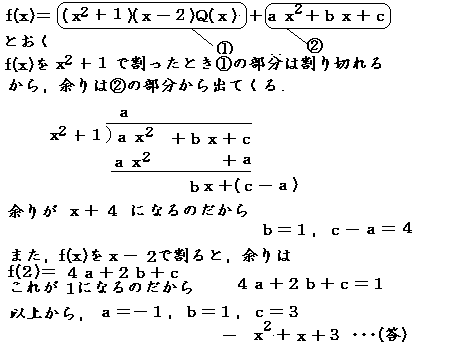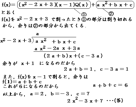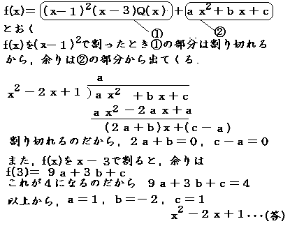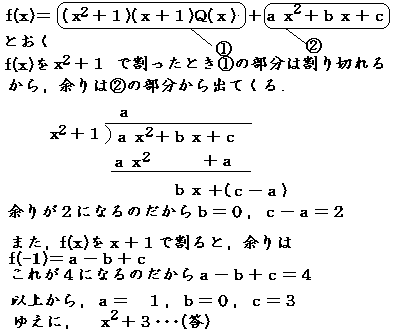 f(x)=(x−1)2(x+1)Q(x)+a(x−1)2+2x+1とおく. P(−1)=3だから4a−1=3 a=1 x2+2・・・(答) ※ 次のように割り算でもできます |
