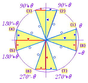(2)〜(8)の比率と同じ比率になるものを(1)の図(角度がθの図)で探し,次に符号を考える.