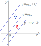 《解説》y=mx+k…(2) のグラフは, y=mx…(1) のグラフをy軸方向に平行移動したものです.(k>0ならば上に,k<0ならば下に平行移動したものです.) y=mx+k'…(3) のグラフも, y=mx…(1) のグラフをy軸方向に平行移動したものです. だから,y=mx+kのグラフとy=mx+k'のグラフは互いに平行です.(特に,k=k'の場合は,2つの直線は一致します.)