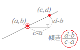 (公式Uの解説)2点(a, b), (c, d)を通る直線の方程式をいきなり考えると,点が2つもあってポイントが絞りきれないので,1点(a, b)を優先的に考える. すなわち,2つ目の点(c, d)は傾きを求めるための材料だけに使う. このとき,2点(a, b), (c, d)を通る直線の傾きは になるから 「2点(a, b), (c, d)を通る直線」は 「1点(a, b)を通り傾き に等しくなる. (*1)により y−b= これで公式Uの(1)が証明された.
