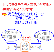 (1つ前に習う公式)1点(a, b)を通り,傾きmの直線の方程式は y−b=m(x−a) です.