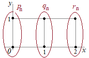 n秒後にXのx座標が0である:(0, 0)または(0, 1)にいる確率をpn,x座標が1である:(1, 0)または(1, 1)にいる確率をqn,x座標が2である:(2, 0)または(2, 1)にいる確率をrnで表すと