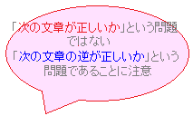 ■ 「△ABCにおいて,2辺の長さが等しいならば両底角は等しい.」の場合において「2辺の長さが等しい」は仮定で,「両底角は等しい」は結論ですが,「△ABCにおいて」は前提といいます.前提は,以下の文章をいう枠組みを示しています. 内容を正確に表現するためには,前提をはっきりさせなければならないことがあります.例えば,「偶数でないならば奇数である」という文章は,「整数において,偶数でないならば奇数である」の意味ならば正しいのですが「どんな場合でも,偶数でないならば奇数である」といえば正しくありません.(偶数でないものには小数や分数もあります.) 前提は,逆にとっても前提とします. 例7 |