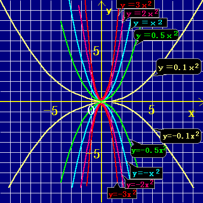 y=ax2のグラフは,どんなaの値に対しても,頂点は原点になります.(ただし,a=0のときは除く.) |