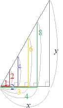 【例1】右図のように1つの斜辺を縦横に切ってできる直角三角形の縦の長さyと横の長さxの関係