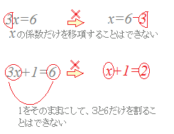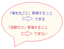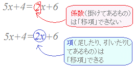 ![]() 図のように、移項できるのは足し算や引き算で区切られた「項」丸ごとです。係数だけを移項できると考えてはいけません。 1次方程式の計算がうまくできない中学生が最も間違いやすいのが移項です。