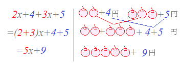3x+xは3x+1x=4xになります. (2x+3)+(x+4)は(2+1)x+(3+4)=3x+7になります.
